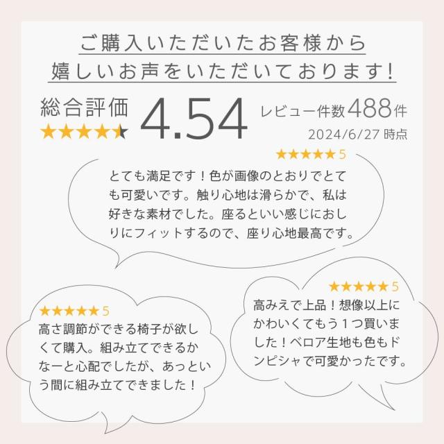 - キャスターを取り付けるのに最初は少しコツがいりましたが、15分弱ほどで1人で組み立てられました。椅子の座り心地も生地もとてもよく、何よりデザインがとても素敵だったので母も喜んだので購入してよかったです...