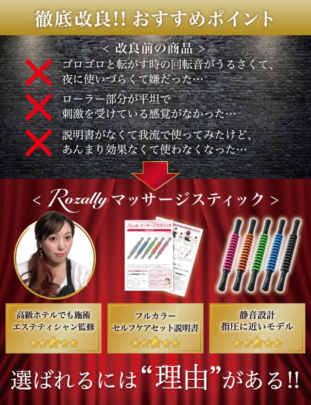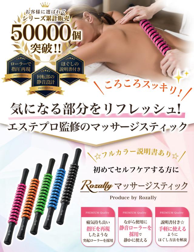 Rozally マッサージスティック (筋膜ローラー) がついに正式販売開始。 ふくらはぎ の むくみ や 肩こり の 解消 に注目されている ローラー タイプ の” マッサージスティック ”です。 長時間のデスクワークや立ち仕事で カチカチに疲れてしまった筋肉に コロコロ と当てて頂き心地よい リラックス タイムを過ごして頂くために開発。 企画&設計では【現役エステティシャン】の先生から アドバイスをもらい、 足 の むくみ や 肩こり など色々な使用方法を 説明書として添えて企画&開発しました。 |