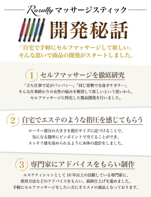 様々なメーカーから 筋膜リリース 用品として ” フォームローラー ”や” 筋膜ローラー ”の 回転式 マッサージローラー が販売されていますが、 Rozallyの マッサージスティック[筋膜ローラー]は ”こだわり”が一味違います。 マッサージ棒 や エステ用品 など 体のメンテナンス アイテムをメインに取り扱っている 10社以上の工場からサンプルを取り寄せ、 「指圧に近い突起」を一緒に試行錯誤して頂けた 1社に絞って発注を行なっています。 本商品の使用前にご入浴の上、 ご自身の指圧にて セルフ マッサージ で ほぐし を行って頂けますと効果を実感しやすくなります。 |