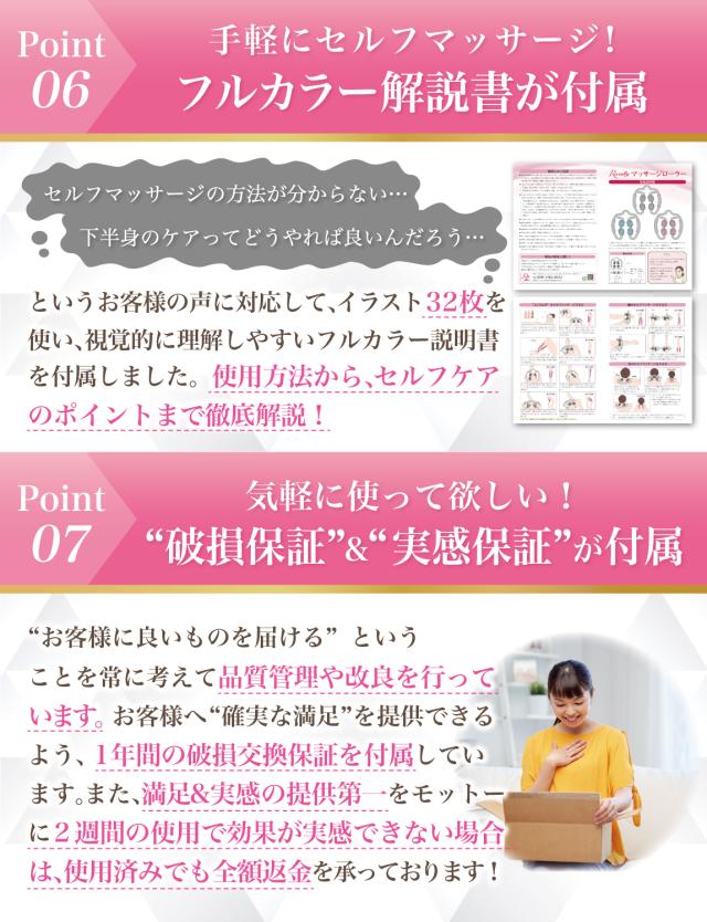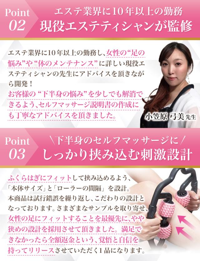 企画&設計では【現役エステティシャン】の先生からアドバイスをもらい、 足 の むくみ や 筋膜リリース など色々な使用方法を説明書として添えて企画&開発しました。