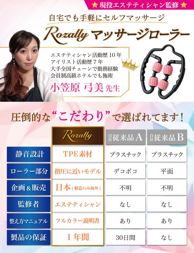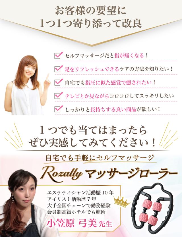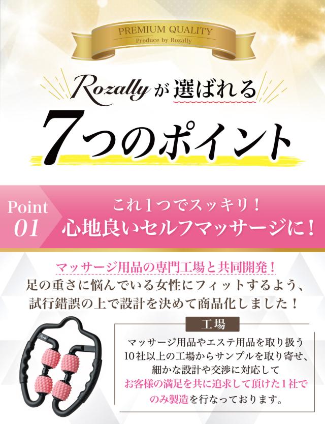 Rozally マッサージローラー がついに正式販売開始。 ふくらはぎ の むくみケア をする時に指圧だと指が痛い… というお客様に人気の 挟む式 の” マッサージ ローラー ”です。 長時間のデスクワークや 立ち仕事でズッシリと疲れてしまった足に コロコロ と挟み込んで心地よい リラックス タイムを過ごして頂くために開発。 企画&設計では【現役エステティシャン】の先生から アドバイスをもらい、 足 の むくみ や 筋膜リリース など色々な使用方法を 説明書として添えて企画&開発しました。 |