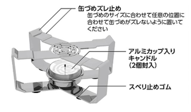 | 使用燃料 | アルミカップ入りキャンドル(キャンドル径38mm 高さ18mm程度) (2個封入) |