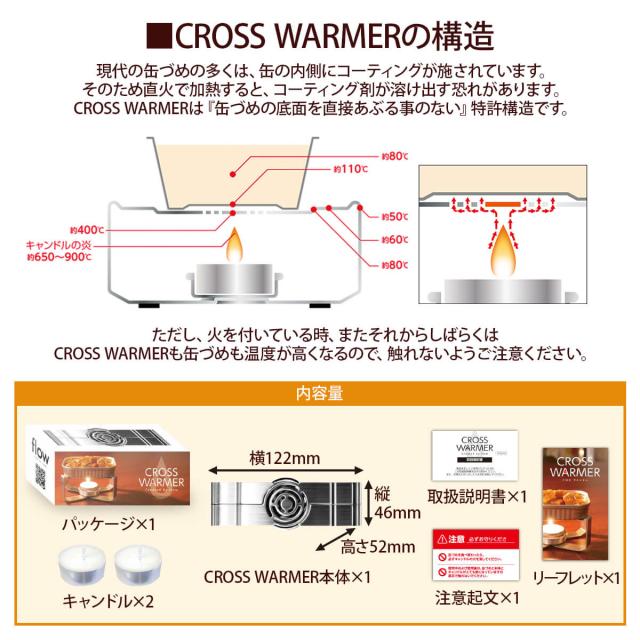 | 使用方法 | お好みの缶づめを開蓋後この「CROSS WARMER」を使用して 温めた状態でお召し上がりが可能です。![]() 【ご注意】 ※液のない缶づめには使用できません。 ※加熱燃料は、当社推奨品(アルミカップ入りキャンドル)以外は絶対に使用しないでください。 《商品を正しくご使用いただくために、付属の取扱説明書を必ずお読みください。》 |