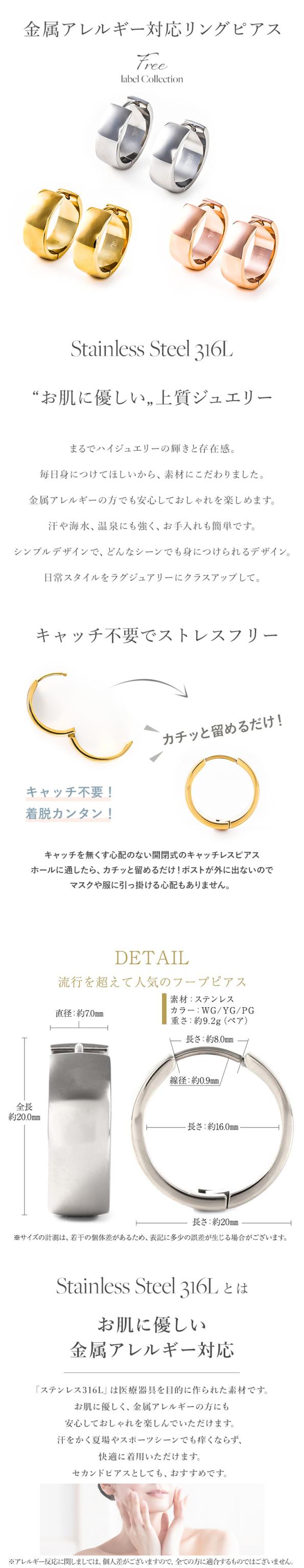 | サージカルステンレス 「 ステンレス316L 」は、汗などに接触しても金属が溶け出しにくく、アレルギー反応を起こしにくい、「 金属アレルギー対応 」の肌に優しい素材です。インプラントなどの医療現場でも使われている素材です。ステンレスには必ず番号がありますので「 Stainless steel 316L 」など、番号が明記されている商品のご購入をおすすめします。 ”錆びにくく変色も少ない”ため、汗をかいてもかぶれない、かゆくならないことが多く、スポーツや「 つけっぱなし 」にされたい方にも人気。さらに、” ワンタッチ ”タイプの「 フープピアス 」はキャッチがなく、着脱も簡単で、女性だけでなく男性にもおすすめです。" ノンアレルギー "対応の「 アレルギーフリーピアス 」として、ジュエリースタジオ プラスターの【 フリーレーベルコレクション 】が好評を得ています。 ※こちらの商品は、医療用の器具に使用しているステンレスと同じ素材のステンレスになりますが、医療器具ではありません。アレルギー反応には個人差がございますので、全ての方に適合するものではありません。 |