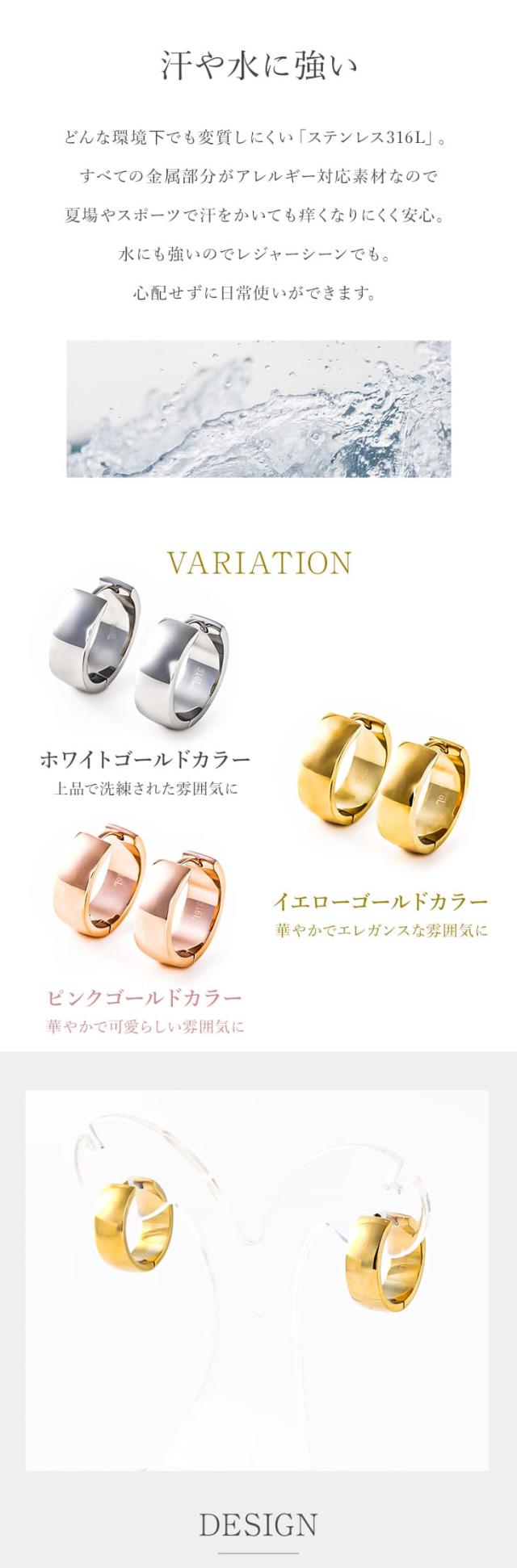 「 ステンレス316L 」を選んだ理由「 サージカルステンレス316L 」は、”錆びにくく変色も少ない”という特徴があります。そのため、汗などに接触しても金属が溶け出しにくく、アレルギー反応を起こしにくいので、近年金属アレルギー対応のジュエリー素材として使用されています。アレルギーの方でも安心・安全にオシャレを楽しんでいただきたいからこそ、素材にこだわりました。