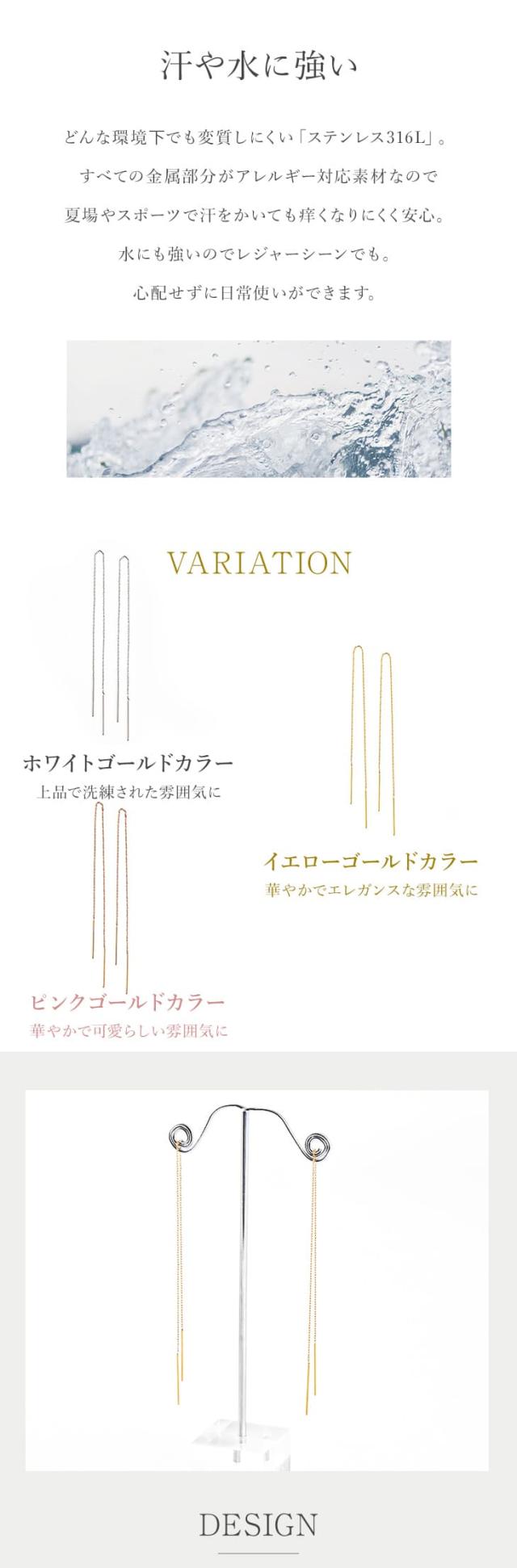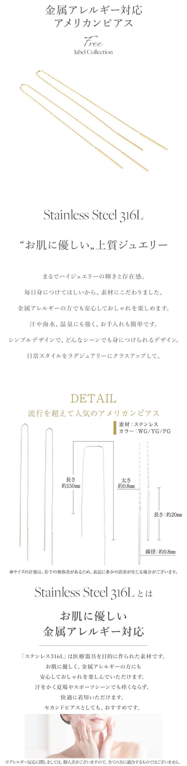 「 アメリカンピアス 」はカジュアルにもフォーマルにも使える人気の耳飾り。前後の長さを変えてアシンメトリーに装っても♪華奢で上品なロングピアスはオフィスや通勤はもちろん、リモートワークのときに、お顔周りを華やかに見せてくれます。「 ステンレス 316L 」は金属アレルギーに対応しているので、お肌に優しく安心です。