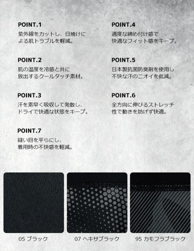 接触冷感、吸汗速乾、全方向ストレッチ、抗菌防臭、UVカットなど高機能で、ハイテンションの高品質ナイロン混素材ですので、繰り返しの着用や洗濯でも伸びっぱなしになりにくく丈夫で長持ちします。