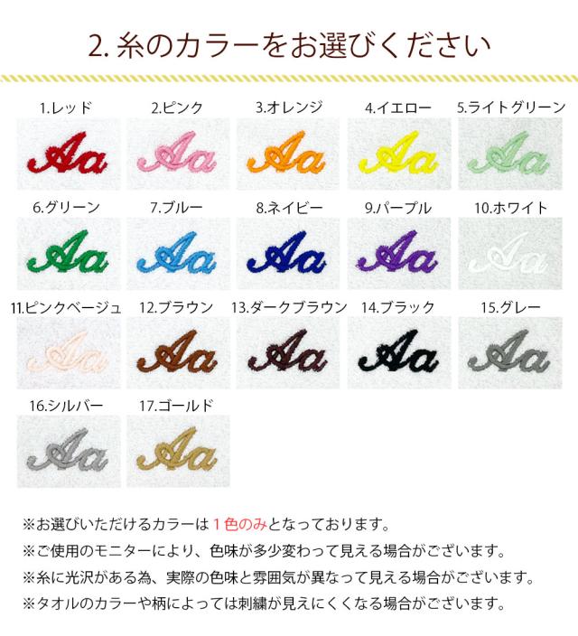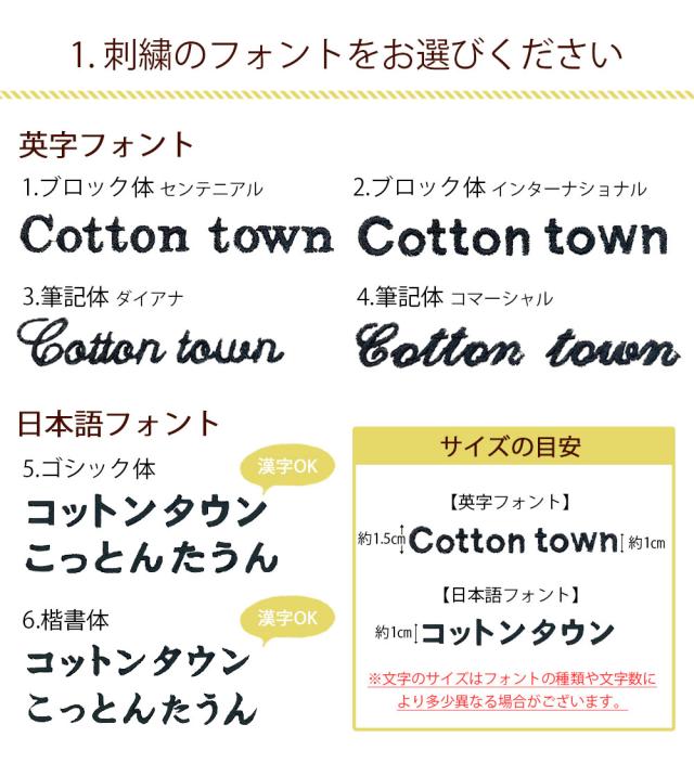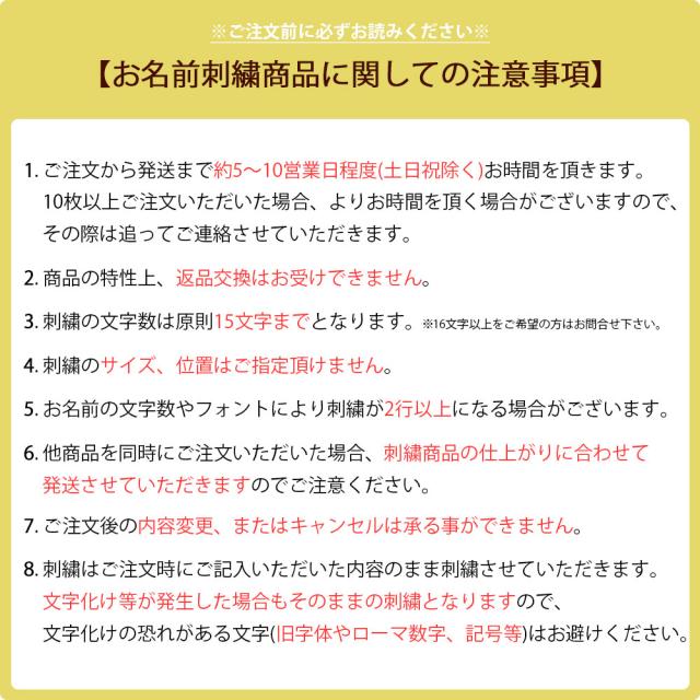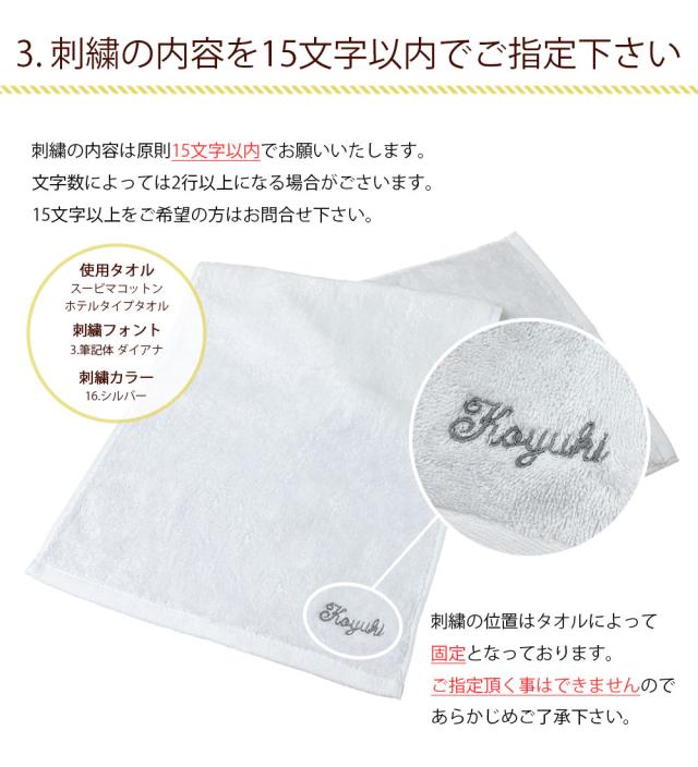3. 刺繍の文字数は原則15文字までとなります。※16文字以上をご希望の方はお問合せ下さい。