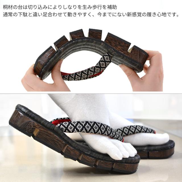 桐材の台に切り込みを入れたデザインでソールがしなりやすく、歩行をサポートします。