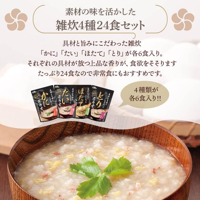 | 内容量 | ■ 具材と旨味にこだわった 雑炊 かに雑炊 250g たい雑炊 250g ほたて雑炊 250g とり雑炊 250g 4種 各6食 合計24食 |
