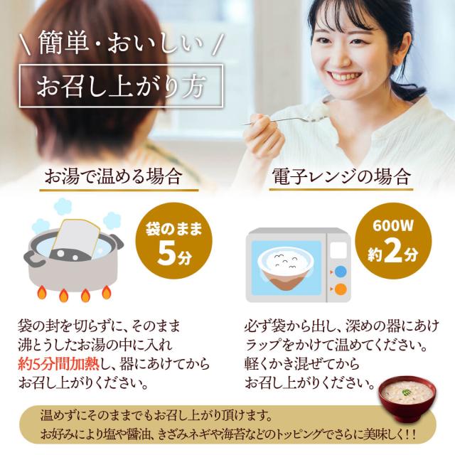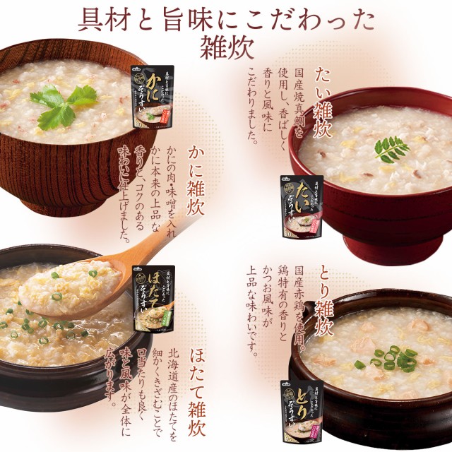 そのまま でも食べれて レンジ 湯煎 で温めると更に 美味しい 。低カロリー で 味の種類も豊富、 朝食 や 夜食 に おすすめ 。こだわり 具材 と 上品な 旨み の たい 雑炊 カニ 雑炊 ホタテ 雑炊 鶏 雑炊