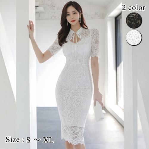 【グラシア】 キャバ ドレス キャバドレス ワンピース ミディアムドレス オーソドックス フェミニン 肌魅せ リボン 華やか 大人 透け感 レース アイラッシュレース ブラック ホワイト S M L XL