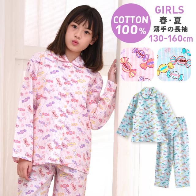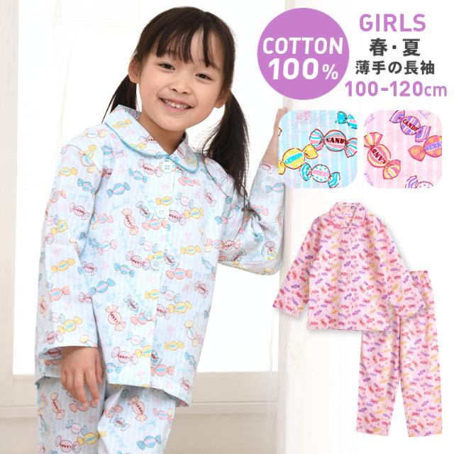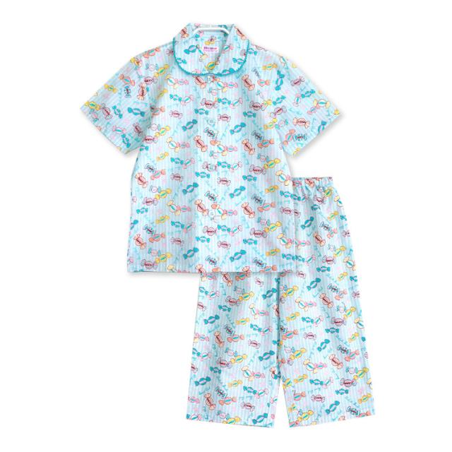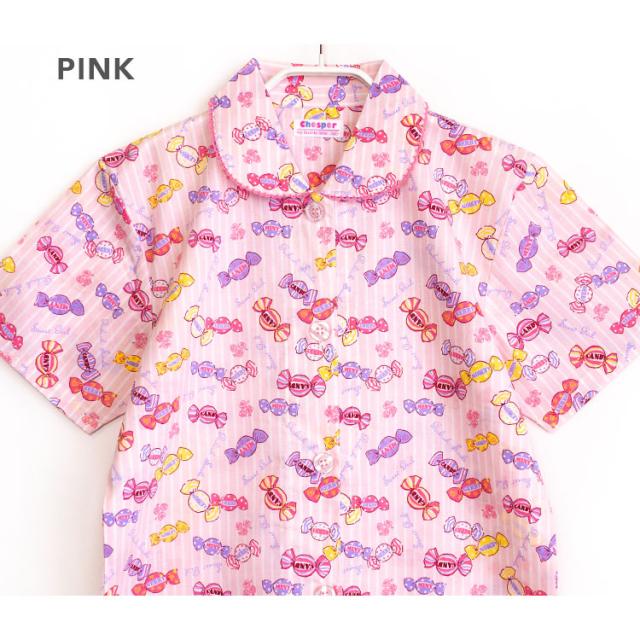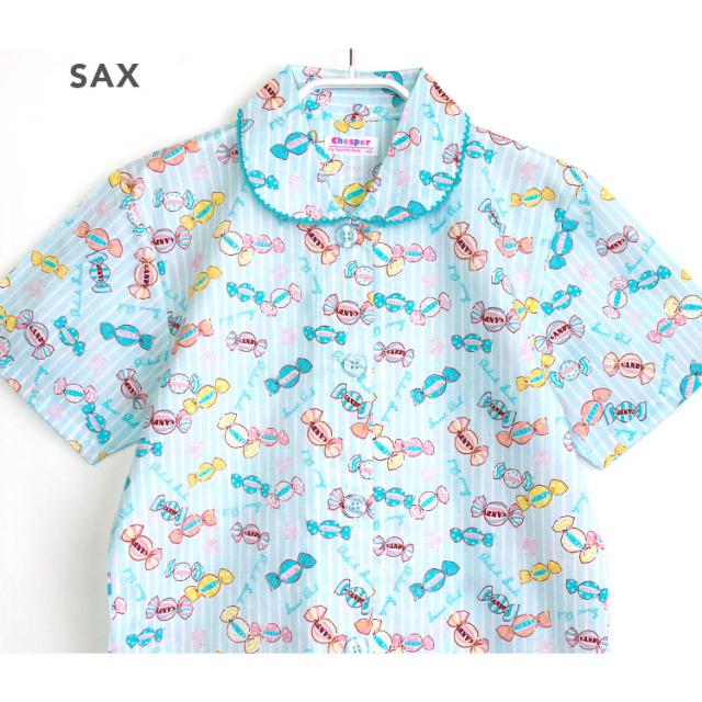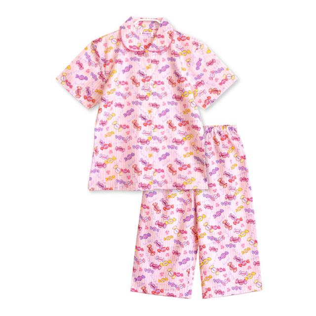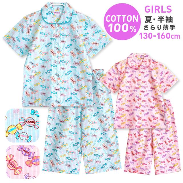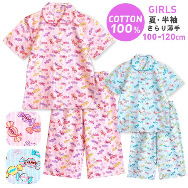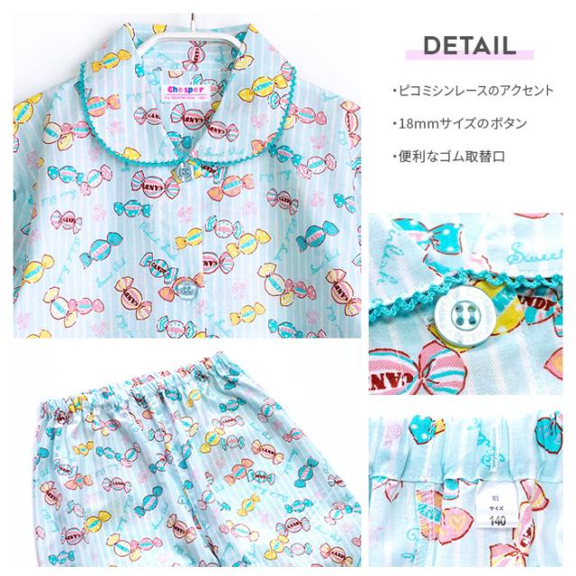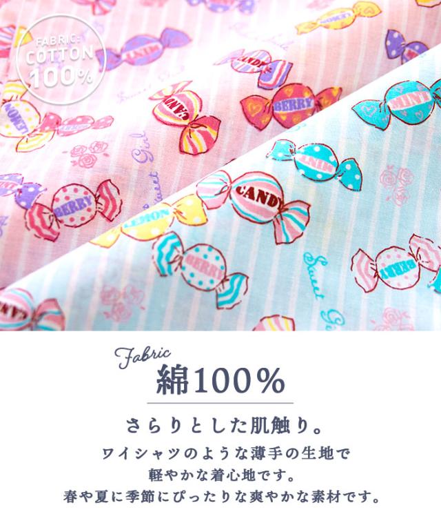 パジャマ キッズ 女の子 綿100% 半袖 春 夏 前開き ボタン かわいい キャンディ柄 薄手のシャツ サックス ピンク 100 110 120 子供 ジュニア ガールズ おそろい メール便なら 送料無料