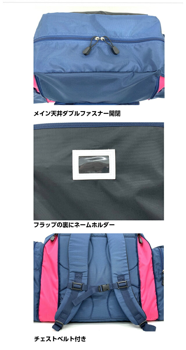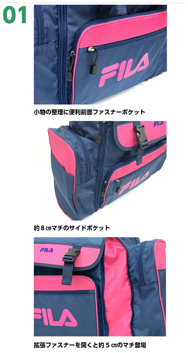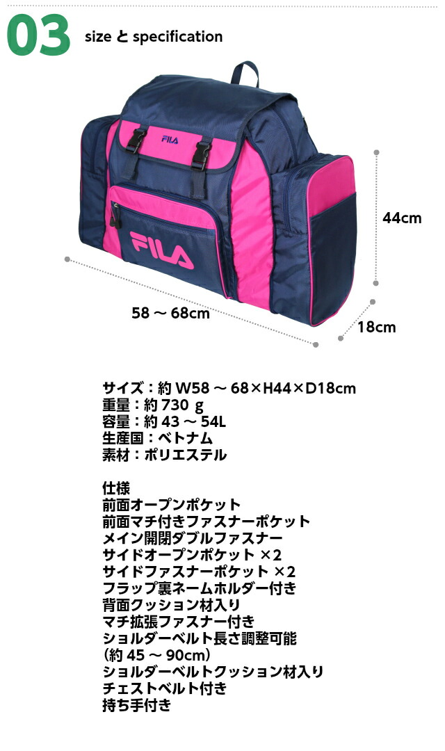 ![]() ![]() ![]() ![]() ![]() ・FILA リムーブ 前面のロゴが目を引くFILAのサブリュック。 43〜54Lの大容量サイズ。サイドファスナーを開くとマチが広がり容量がアップします。 500mlペットボトル収納可能なサイドポケットやずれ落ち防止のチェストベルト等使い勝手も抜群! 修学旅行や林間学校・宿泊学習・部活・スポーツ・旅行などにピッタリ!