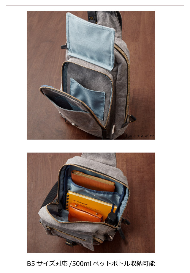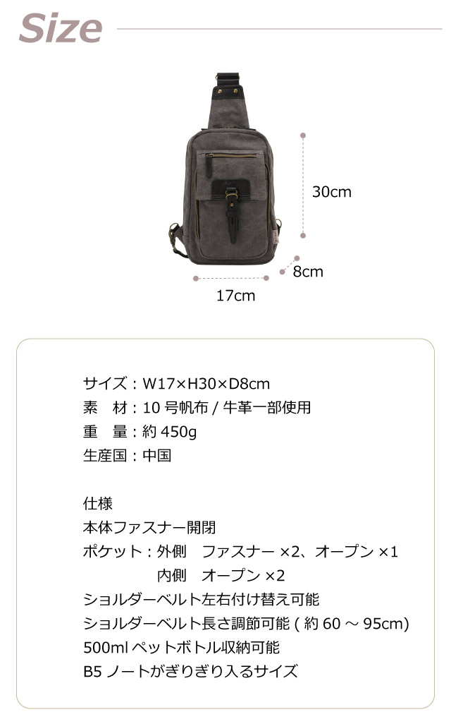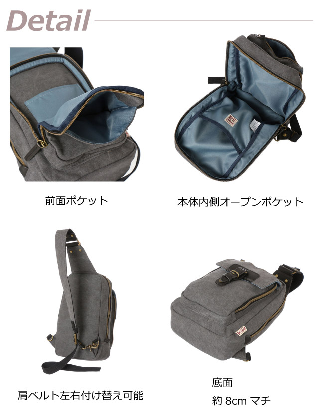 ![]() ![]() ![]() ![]() ![]() ![]() ・帆布工房 (はんぷこうぼう) 本革ギボシベルトをアクセントにした、VINTAGEシリーズのボディバッグ。 ムラのある10号帆布使用。 本体前面のフラップの部分にファスナーポケット、フラップをめくると更にオープンポケットとファスナーポケットが。本体内部にもオープンポケット付き。 コンパクトながらB5サイズがちょうど入る大きさで、500mlペットボトルが入り、ちょっとしたお買い物やお出かけに使いやすいサイズです。