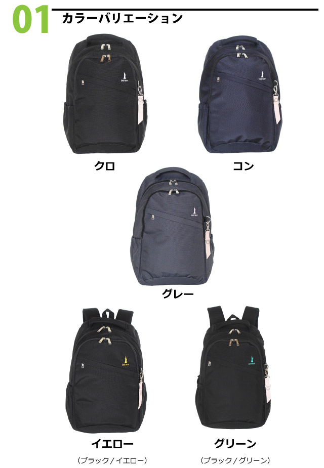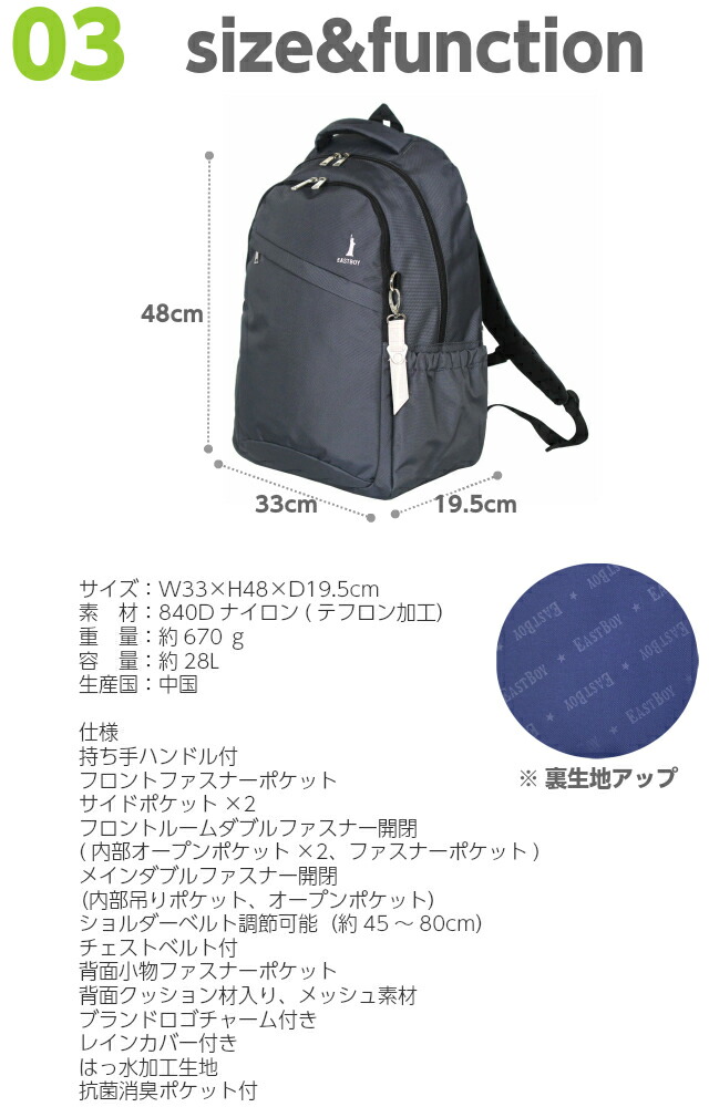 ![]() ![]() ![]() ![]() ![]() ![]() EAST BOY(イーストボーイ) 女子中学生、女子高校生に大人気のEAST BOYのリュック! 無地のシンプルなデザインにロゴストラップと女神の刺繍がポイント。大容量の28Lで、通学や部活にぴったり! 抗菌防臭加工や撥水、タブレットなどの機器が入れられるクッションポケットや財布や定期が収納できるシークレットポケットなど便利な機能がいっぱい! リフレクター(反射材)付きレインカバー付きで雨の日も安心。