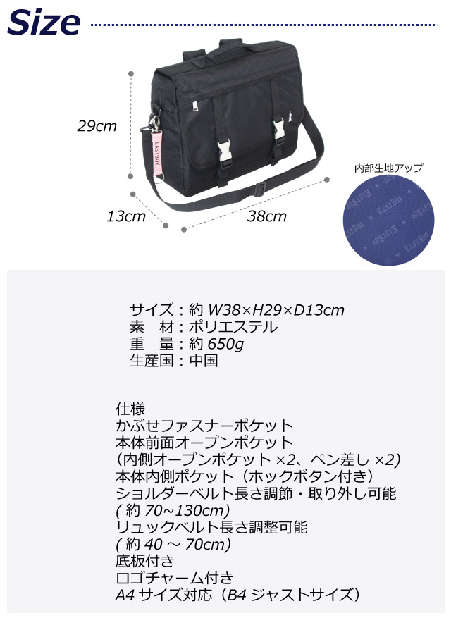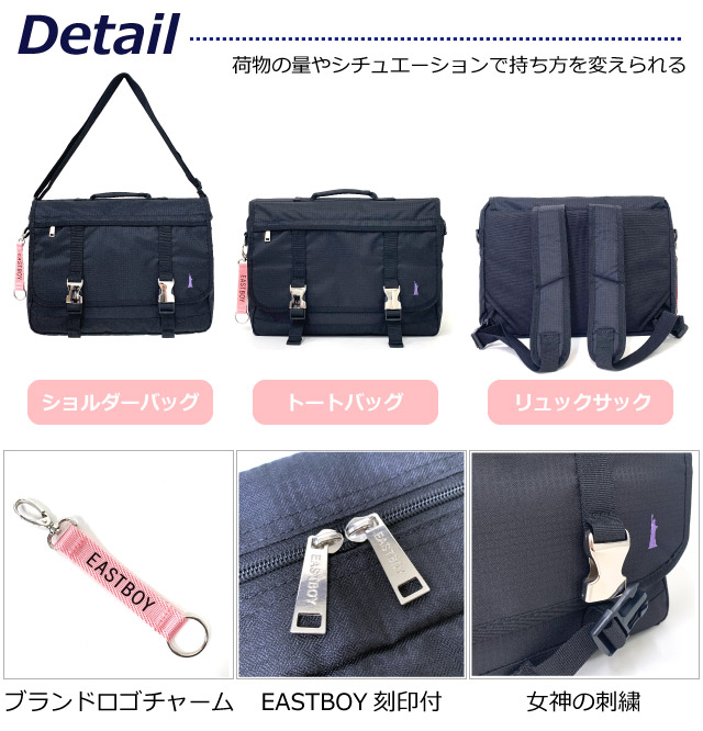 ![]() ![]() ![]() ![]() ![]() ![]() ・ EAST BOY(イーストボーイ)エチュード 通学や旅行をイメージしたエチュードシリーズ。 女神の刺繍とロゴチャームがポイントとなり、華やかさを演出しています。 A4サイズ収納対応サイズ。 リュック・ショルダー・手提げバッグとして3通りに使え、通学・通塾・レッスン等に人気です。