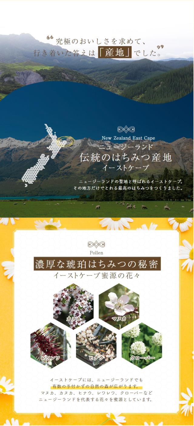 | [商品説明] | ニュージーランド北島のイーストケープにある神秘の森で咲く植物(ヒナウ、カヌカ、マヌカ、レワレワ、クローバーなど)から採蜜された琥珀色の濃厚な はちみつ。 |