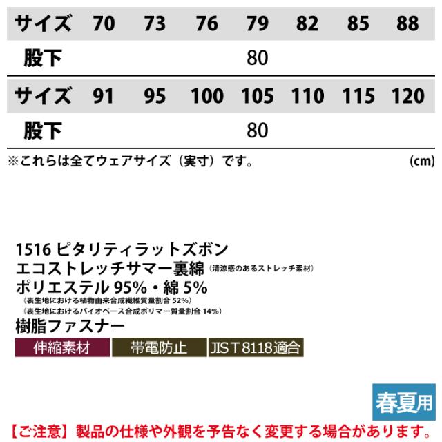 ジーベック XEBEC 作業服 春夏用 1516 ピタリティラットズボン 105-120 作業着