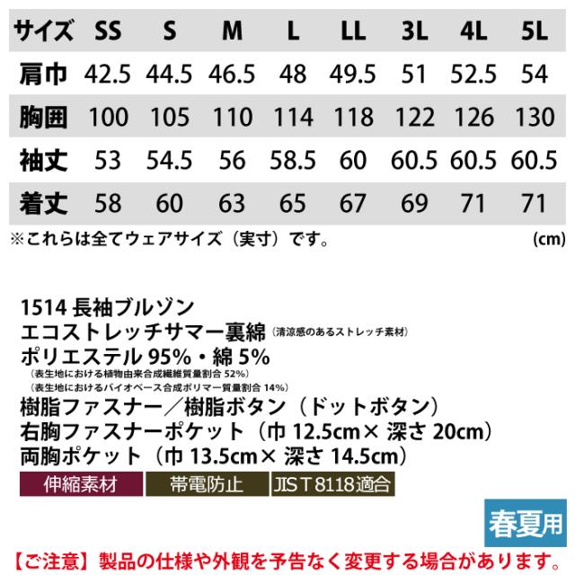 ジーベック XEBEC 作業服 春夏用 1514 長袖ブルゾン SS-LL 作業着
