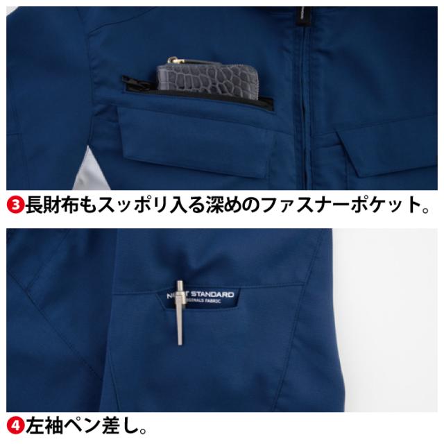 ◇機能:長財布もスッポリ入る深めのファスナーポケット・左胸ポケット脇ペン差し付き・胸フラップポケットは面ファスナー仕様・左袖ペン差し・左右内ポケット・袖口は2段階に調整できるアジャスター付き・裾は2段階に調整できるアジャスター付き