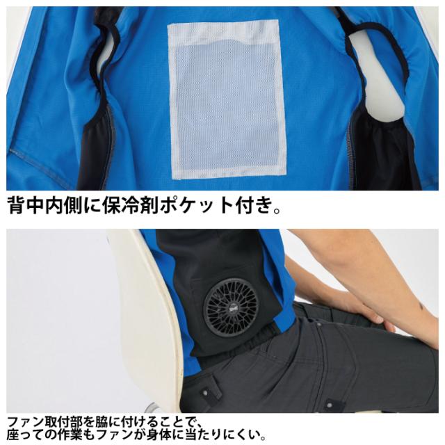 ◇機能:右胸ファスナーポケット。反射フレーム付き左胸ペン差し。左内側バッテリーポケット。首元の調整ヒモで空気の抜けを調節。袖口はニットバインダー仕様で空気が逃げにくい。背中内側に保冷剤ポケット付き。ファン取り付け部を脇に付けることで・座っての作業もファンが体に当たりにくい。