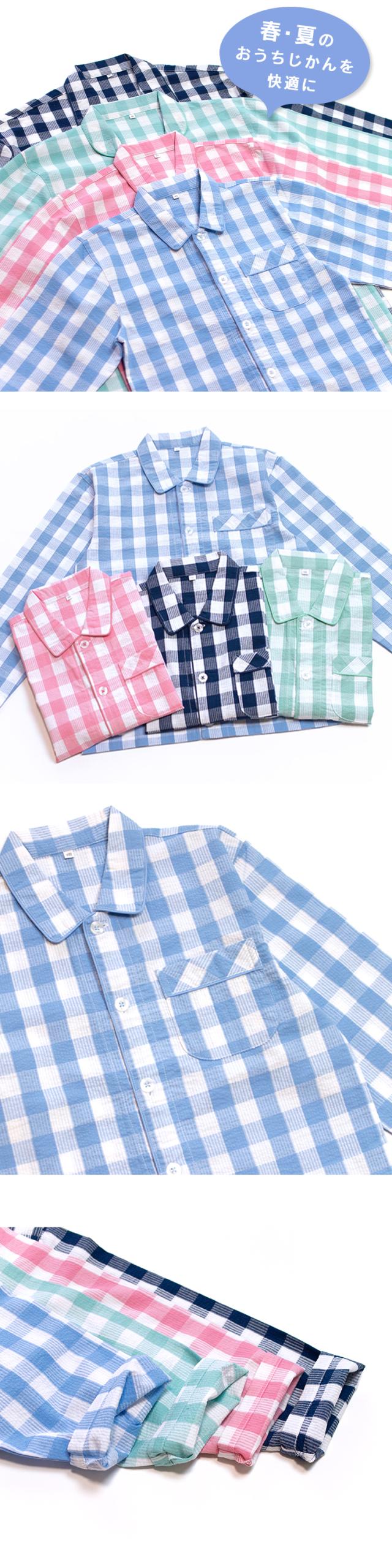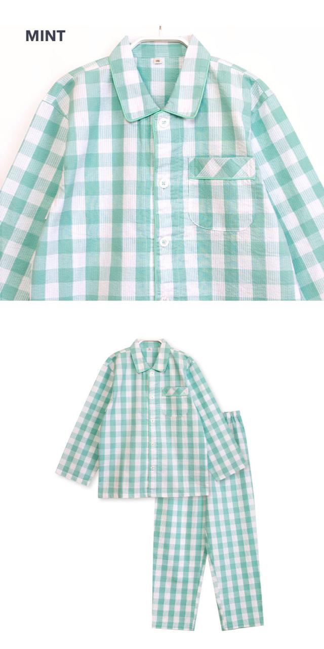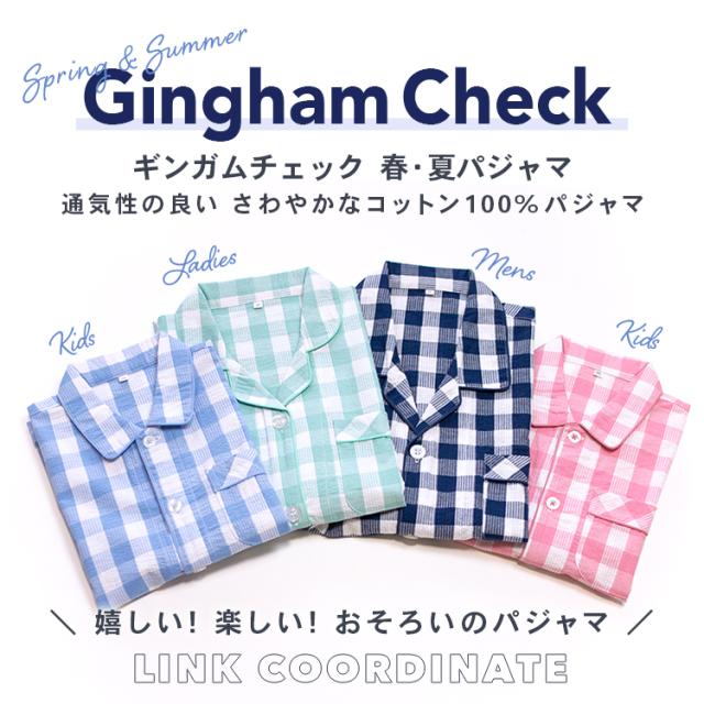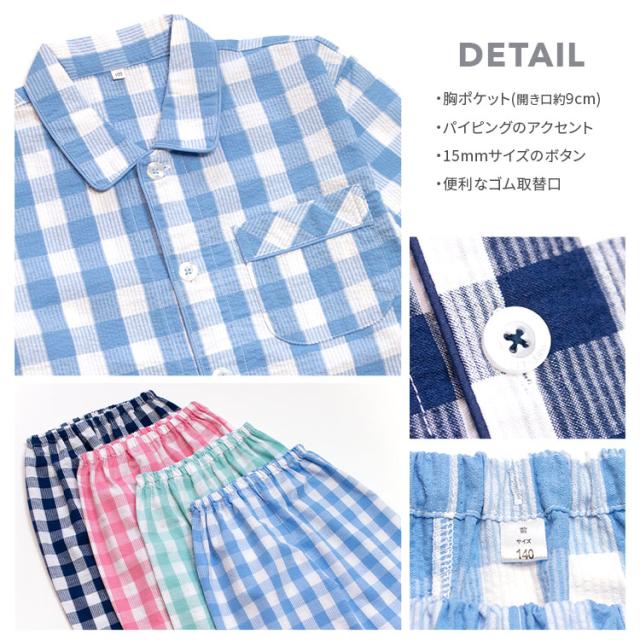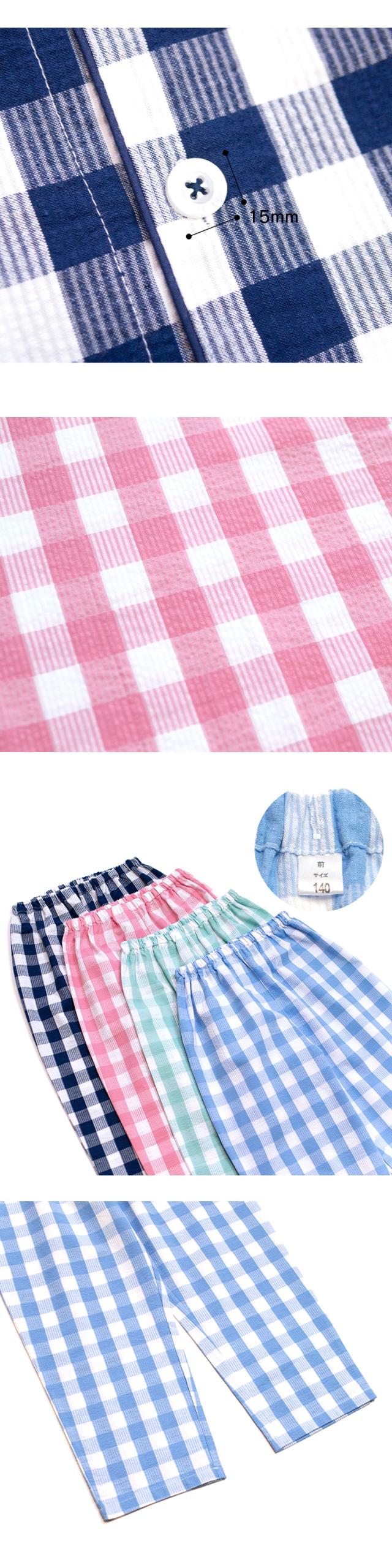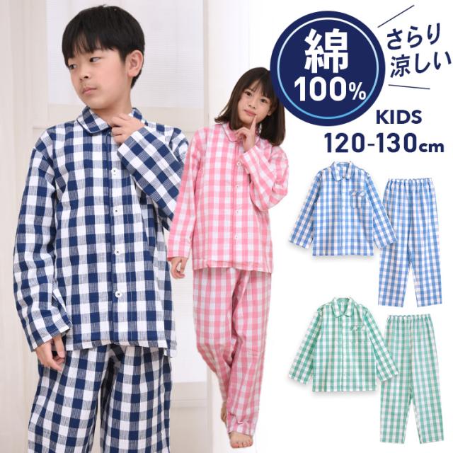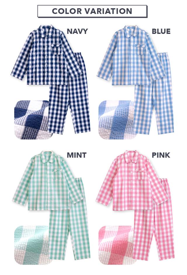 パジャマ キッズ 男の子 女の子 綿100% 長袖 春 夏 先染めサッカー 前開き ボタン シャツ ギンガムチェック ネイビー ブルー ピンク ミント 140 150 160 おそろい