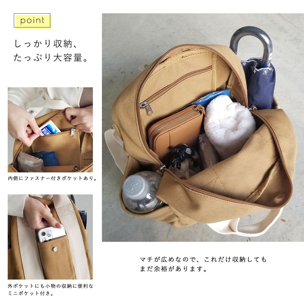 長財布、ポーチ、エコバッグ、フェイスタオルetc...かさばる物も余裕で収納できます。