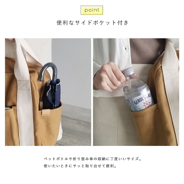 サイドポケットはペットボトルや折り畳み傘の収納にちょうどいいサイズ。