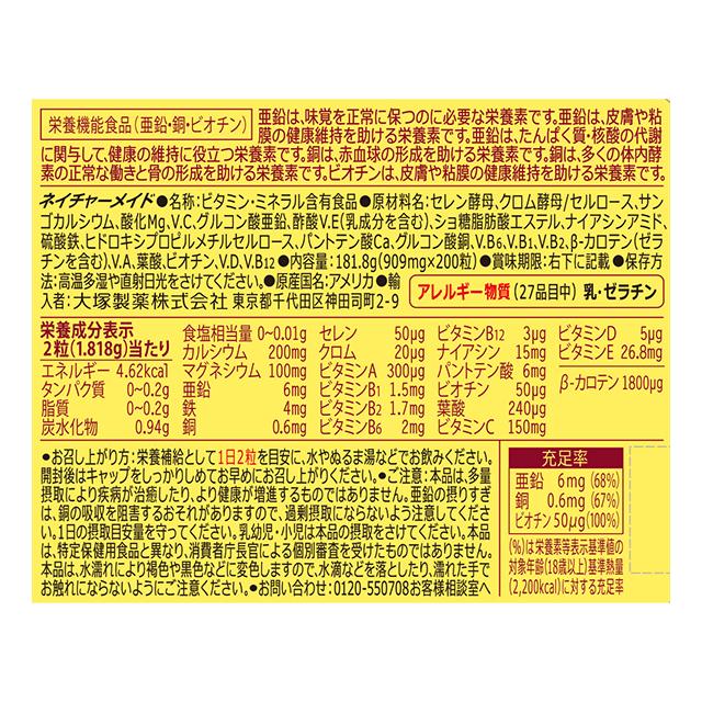 商品名 ネイチャーメイド マルチビタミン&ミネラル 100日分 200粒 2セット 栄養機能食品 大塚製薬 容量 100日分 200粒 2セット 原材料名 セレン酵母、クロム酵母/セルロース、サンゴカルシウム、酸化Mg、V.C、グルコン酸亜鉛、酢酸V.E(乳成分を含む)、ショ糖脂肪酸エステル、ナイアシンアミド、硫酸鉄、ヒドロキシプロピルメチルセルロース、パントテン酸Ca、グルコン酸銅、V.B6、V.B1、V.B2、β−カロテン(ゼラチンを含む)、V.A、葉酸、ビオチン、V.D、V.B12 アレルギー特定原材料 乳成分 生産国 米国 加工地 米国 賞味期限 商品の発送時点で、360日以上あるものをお届けいたします 保存方法 常温 お召し上がり方 栄養補給として1日2粒を目安に、必ず水やぬるま湯などでお飲みください。