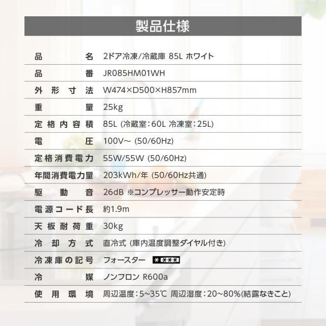 * 定格容量積:85L(冷蔵室:60L 冷凍室:25L)