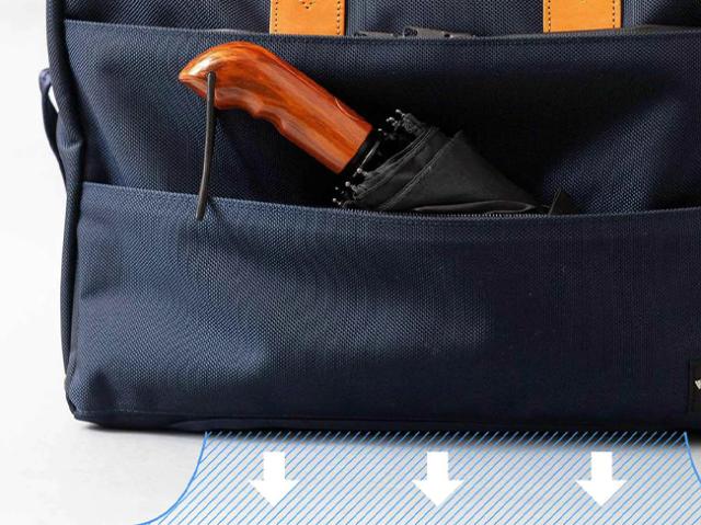 WRシリーズには濡れたものを、濡れたまましまえる防水ポケットを配置しています。ポケットの下部がメッシュになっており、そこから水が排水され溜まらない仕様に。突然の雨や濡れた折り畳み傘。結露したペットボトル、ジムで使ったタオルやウェアなど、使用シーンはさまざまに。