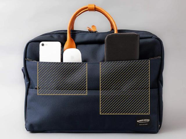 長財布とスマートフォン、バッテリーやペンなど、デバイスやツールによって必要なポケットの深さは違います。感覚的に使いこなせるように、前面に深さの違う二つのポケットを配置。ファスナーには止水処理を施し電子機器やレザー製品の収納にも安心感を与えます。