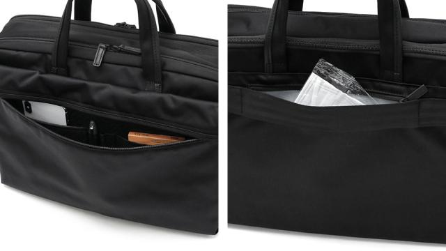 B4サイズ対応の本体は、効率よく荷物を収納できる2層構造。前面側の収納部は、クッション性抜群のPC収納や小物用のポケットなどを複数備えた実用的な設計。背面側の収納部は大きめのポケットを2つ備えたシンプルなつくりで、ファイルや書類などの収納に最適なスペースとなっています。
