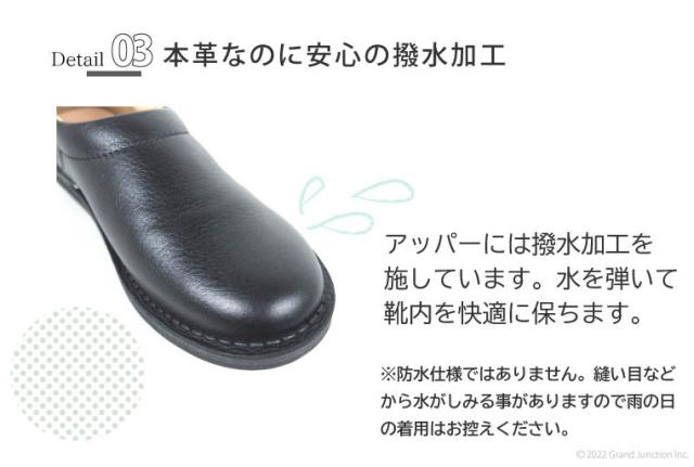 濡れても水を弾き、水滴をさっと拭けるはっ水加工を施した本革をアッパーに使用。