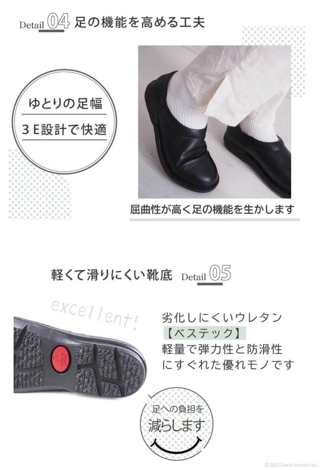 こちらは内側ゴア付きで履きやすいシンプルなスリッポンタイプです。 濡れても水を弾き、水滴をさっと拭けるはっ水加工を施した本革をアッパーに使用。 独自開発の「ベステックソール」で、衝撃や足への負担を吸収して心地よい履き心地・歩みをお楽しみいただけます。