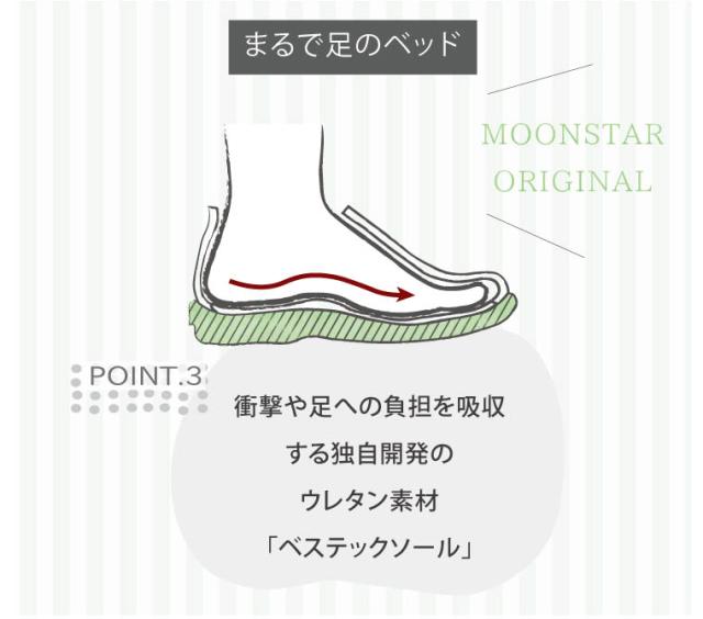 独自開発の「ベステックソール」で、衝撃や足への負担を吸収して心地よい履き心地・歩みをお楽しみいただけます。