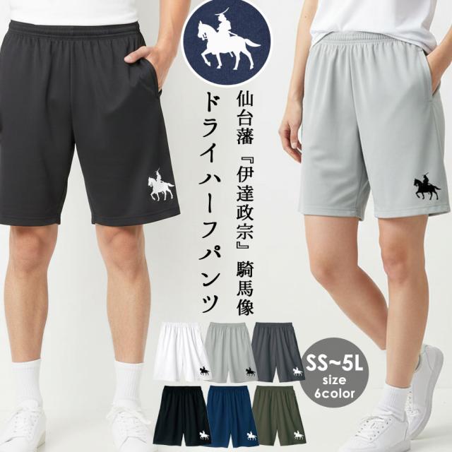 【ハーフパンツ ハーパン ショートパンツ レディース メンズ ボトムス ドライ サラサラ 仙台藩 伊達政宗 騎馬像 ご当地 宮城 仙台 ワンポイント プリント 無地 ウエストゴム メッシュ 吸汗速乾 UVカット 薄手 ジャージ 大きいサイズ スポーツ 運動 ゆったり 快適】