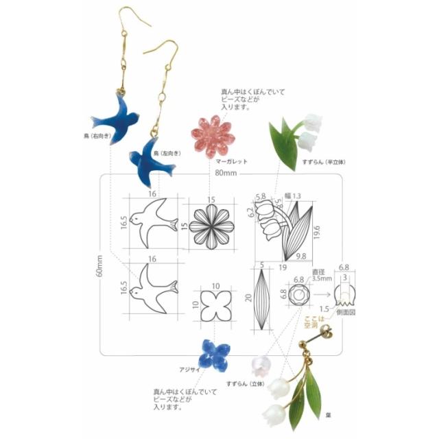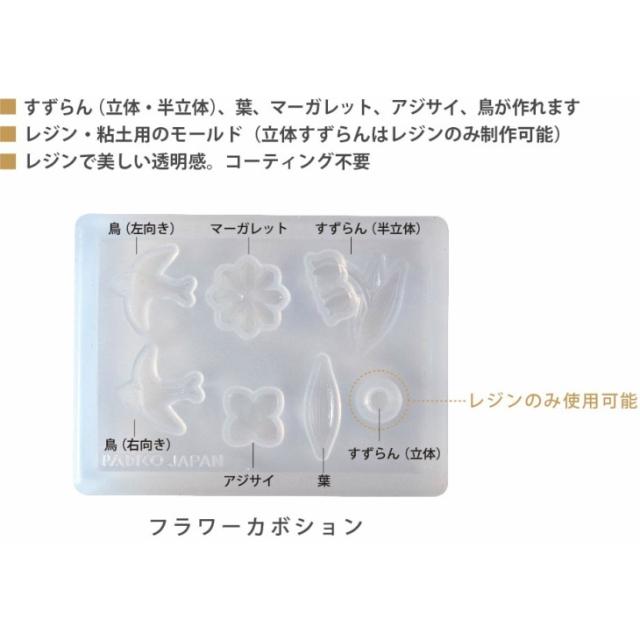 ・すずらん(立体・半立体)、葉、マーガレット、アジサイ、鳥が作れます・レジン・粘土用のモールド(立体すずらんはレジンのみ制作可能)・レジンで美しい透明感。コーティング不要【内容詳細】パジコ シリコーンモールド フラワーカボション 【サイズ】本体サイズ:W80×H60×D10mmパッケージサイズ:W120×H155×D11mm【カラー】半透明【素材】シリコーンゴム【関連キーワード】 シリコンモールド シリコーンゴム ハンドメイド ソフトモールド レジン資材 モールド レジン UVレジン 粘土 型 ジュエル レジン用品 材料 手芸材料 ハンドメイド資材 アクセサリーパーツ パーツさや工房 沙や工房