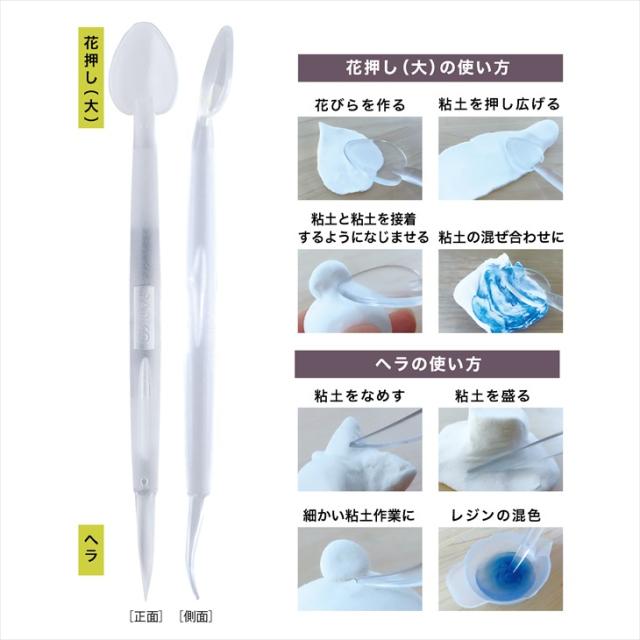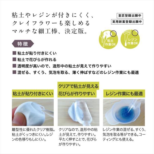 平たく押すことで花びら粘土で花びらが作れる細工棒です。離型性に優れたクリア樹脂を使用しているので、粘土が貼りつきにくいのはもちろん、レジンの色写りもしにくいです。透明度が高いので造形中の粘土が見えて作業がしやすいのもポイント。粘土だけでなく、混ぜる、すくう、気泡を取る、薄く伸ばすなどのレジン作業にも最適です。【内容詳細】パジコ クリア細工棒 〈ヘラ・花押し(大)〉 160×20mm クリア 1個 【サイズ】本体サイズ:W20×H160mmパッケージサイズ:W60×H230×D9mm【カラー】クリア【素材】熱可塑性樹脂・耐熱温度:80℃/耐冷温度:ー20℃【関連キーワード】クリア 1個 1ヶ ハンドメイド 透明 レジン雑貨 UV LED 粘土 ねんど ジュエルラビリンス アクリル 樹脂 スイーツデコ 着色 混色 混ぜる 棒 スティック レジン資材 レジン用 レジン用品 アクセサリー資材 アクセサリー 素材 部品 材料 資材 アクセサリーパーツ パーツさや工房 手作り
