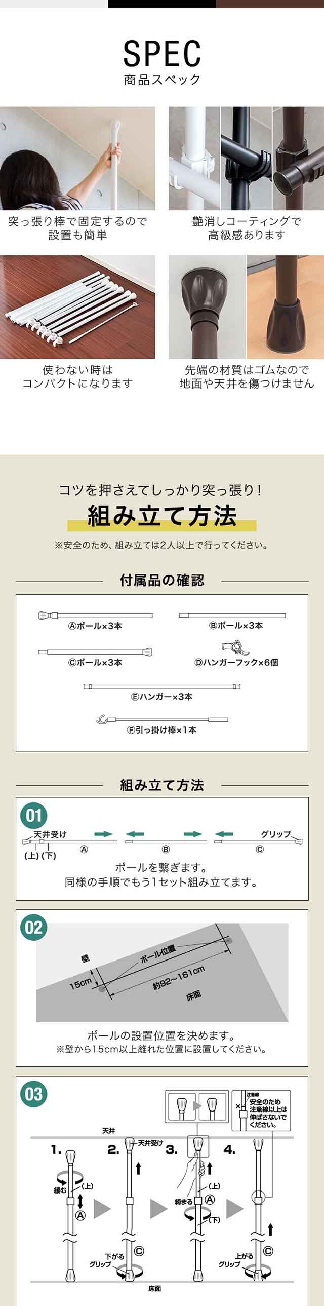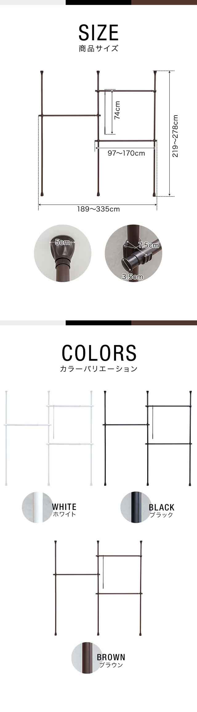 | サイズ: (約)幅189〜335cm×奥行5cm×高さ219〜278cm(最大サイズ) ※ハンガーフックを含む奥行:(約)7.5cm |