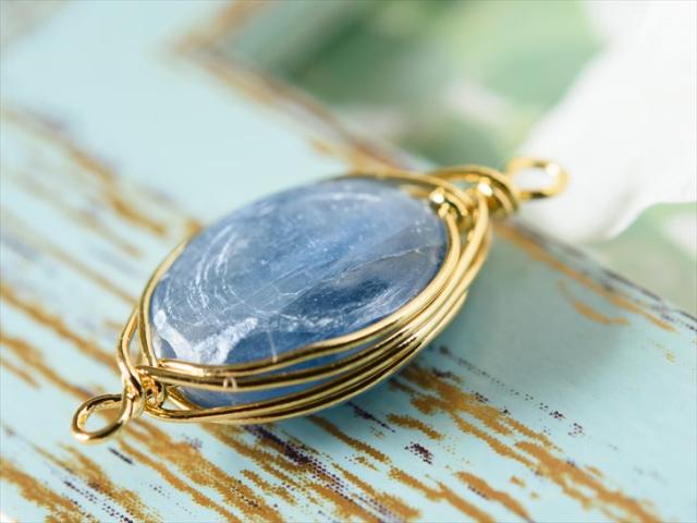 カイヤナイトの天然石をゴールドのワイヤーで優雅にラッピングしたチャームです。