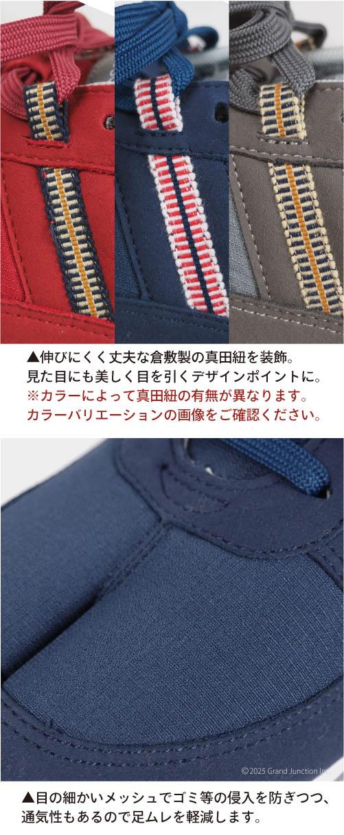 ランニング、ウォーキング、スポーツ等様々なシーンで活躍するスポーティなデザイン。 伸びにくくて丈夫且つ柄が目を引く倉敷産の「真田紐」をシューレースホールに採用!足袋とは異なる、新たな日本らしさがアクセントとして取り込まれています。