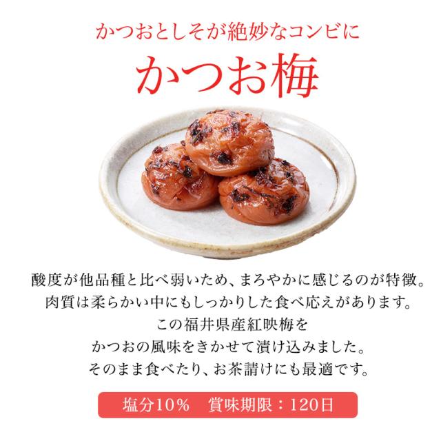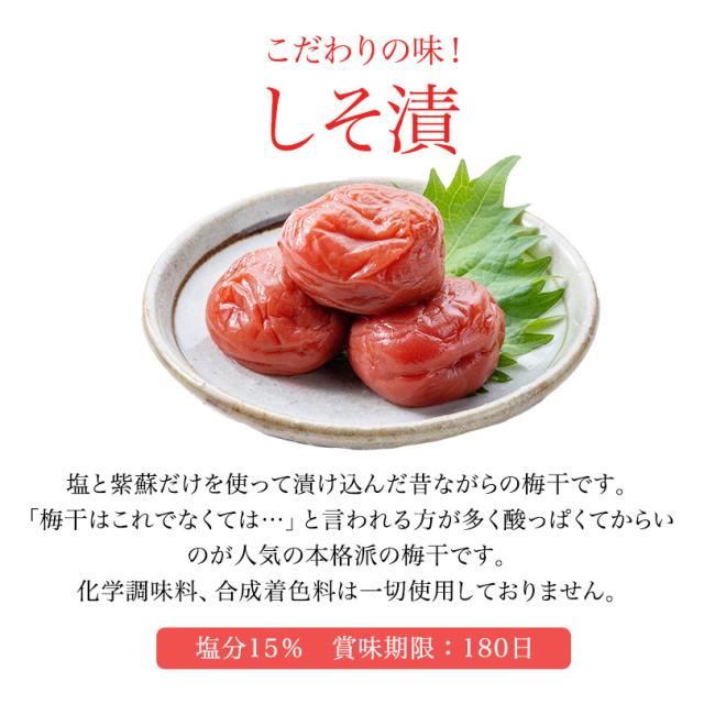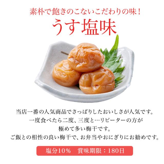 | *うす塩*約10%*しそ漬*約15%*はちみつ*約7%*こんぶ*約8%*かつお*約10%*甘仕立て*約5% |