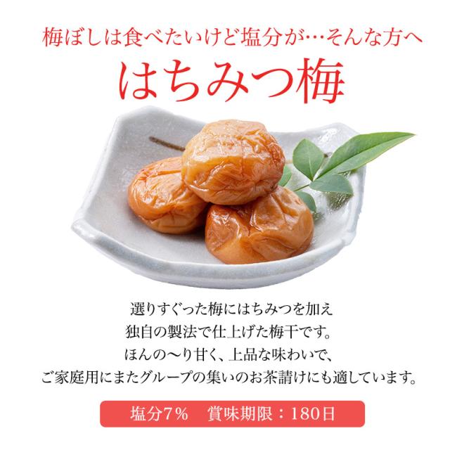 | *うす塩*梅、漬け原材料〔食塩、還元水飴、砂糖、発酵調味料〕、調味料(アミノ酸等)、酸味料、ユッカ抽出物、 ビタミンB1(原材料の一部に大豆を含む)*しそ漬 *梅、漬け原材料〔食塩、しそ〕*はちみつ*梅、漬け原材料〔食塩、果糖ブドウ糖液糖、発酵調味料、はちみつ調味料(アミノ酸等)、酸味料、ユッカ抽出物、 ビタミンB1、甘味料(ステビア)(原材料の一部に小麦を含む)*こんぶ*梅、漬け原材料〔食塩、砂糖、還元水飴、発酵調味料、こんぶ〕、調味料(アミノ酸等)、酸味料、ユッカ抽出物、 ビタミンB1、(原材料の一部に大豆を含む) *かつお*梅、漬け原材料〔食塩、還元水飴、砂糖、発酵調味料、しそ、かつお削りぶし〕調味料(アミノ酸等)、酸味料、ユッカ抽出物、 ビタミンB1、甘味料(ステビア)、野菜色素(原材料の一部に乳糖、大豆を含む)*甘仕立て*梅、漬け原材料[還元水飴、食塩、醸造酢、発酵調味料]酸味料、酒精、調味料(アミノ酸等)(大豆由来)、甘味料(ステビア)、ビタミンB1 |