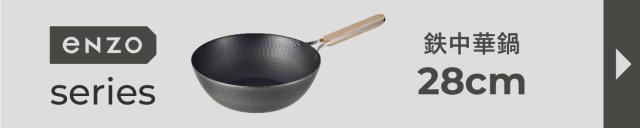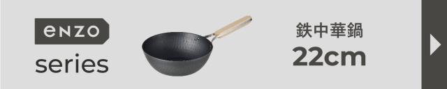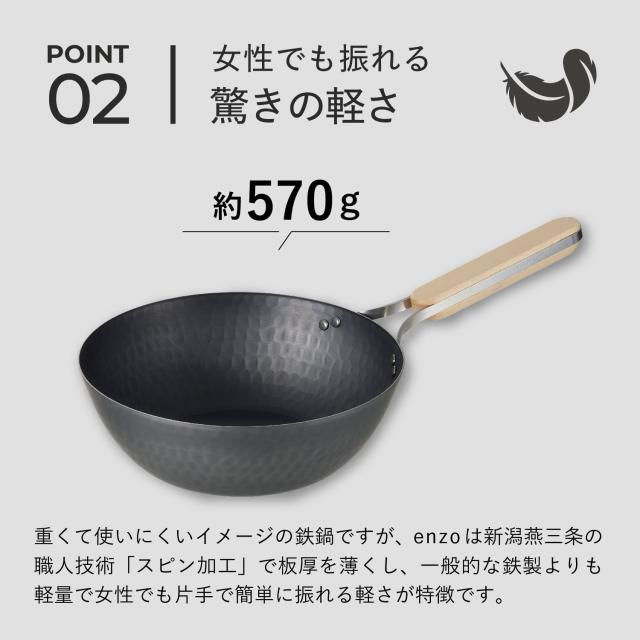 enzoの軽くて扱いやすい22cmの鉄中華鍋です。女性でもあおり調理ができるよう、鉄の良さを残しながら軽さを追求したアイテムです。表面に燕三条を物語る槌目模様を入れることで、加工硬化が生まれ強度を上げている為変形にも強くした仕様になっております。高温調理に強く、食材を入れても熱が下がりにくい蓄熱性に優れております。ハンドル部分は天然木(ブナ)とステンレスのフラットバーを組み合わせ握りやすい形状にこだわっております。