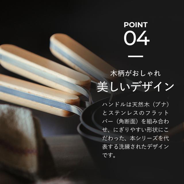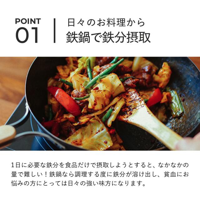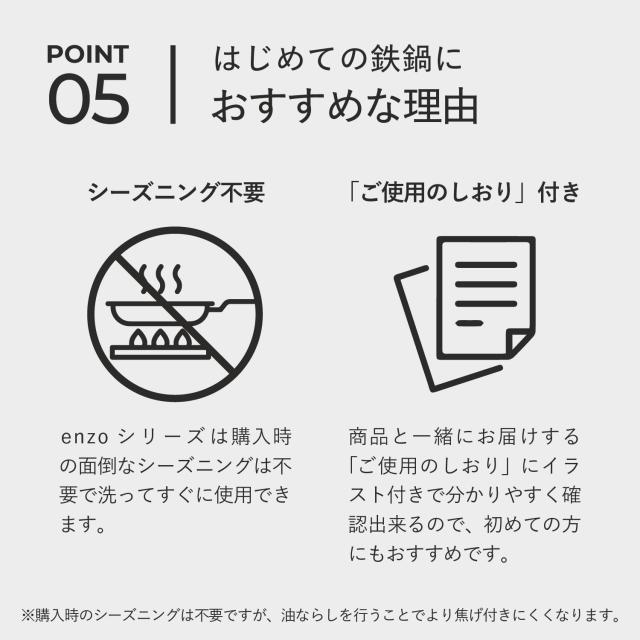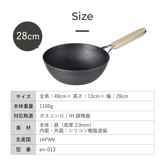 enzoの軽くて扱いやすい28cmの鉄中華鍋です。女性でもあおり調理ができるよう、鉄の良さを残しながら軽さを追求したアイテムです。表面に燕三条を物語る槌目模様を入れることで、加工硬化が生まれ強度を上げている為変形にも強くした仕様になっております。高温調理に強く、食材を入れても熱が下がりにくい蓄熱性に優れております。ハンドル部分は天然木(ブナ)とステンレスのフラットバーを組み合わせ握りやすい形状にこだわっております。