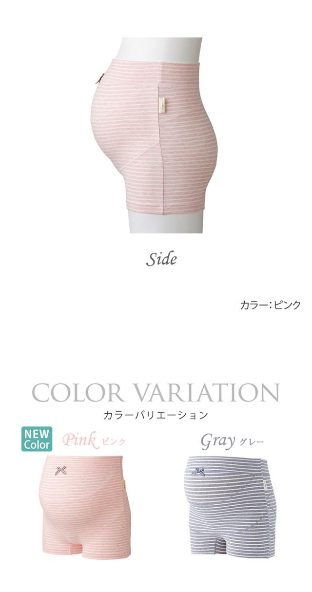 「こんな妊婦帯がほしい!」という先輩ママの声から作られた、ショーツ感覚で履ける妊婦帯。下腹部・腰・ヒップ部分は、お肌に優しい綿生地の2重仕立てになっているため、お腹をサポートしながらヒップラインも整えます。妊娠中の失禁やおりものに対応できるよう、クロッチはナプキンやおりものシートの羽がしまえる2重構造。またクロッチは、綿100%でお肌に優しい厚めのあて布付きです。ウエストゴムを使用していないため、大きなお腹への締め付けを和らげ快適な履き心地を提供。 脚口を締め付けにくく、お腹やお尻をすっぽりと包み込むボクサータイプにすることで着用ストレスを緩和します。肌触りが良く伸縮性のある生地なので、妊娠初期から臨月までご使用いただけます。