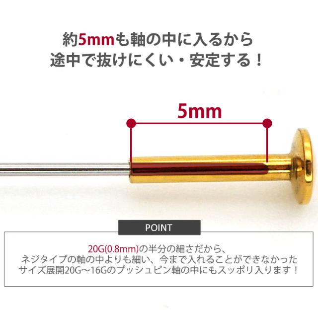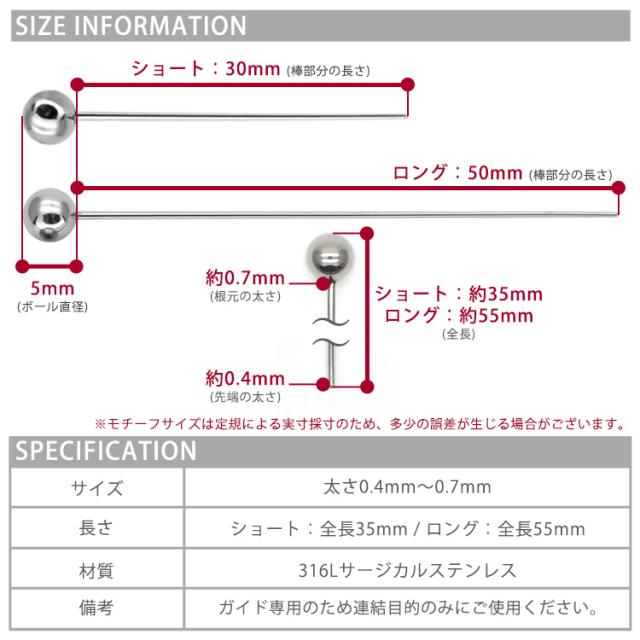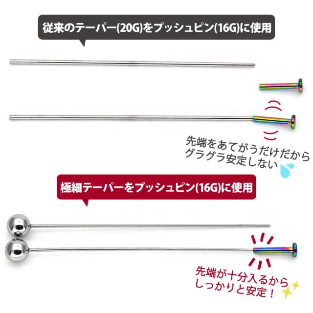 インターナルラブレット、プッシュピンラブレットのボディピアス装着時のガイドとして使用します。先が0.4mmと極細サイズなので、ジュエリーとの接続がしやすく、初めてのジュエリー交換の際でも簡単に行えます。耳の軟骨ピアスやへそピアス、口ピアスなど幅広い部位で使用可能です。 メディカルツール等にも使用されている安全性の高い医療用ステンレス製。
