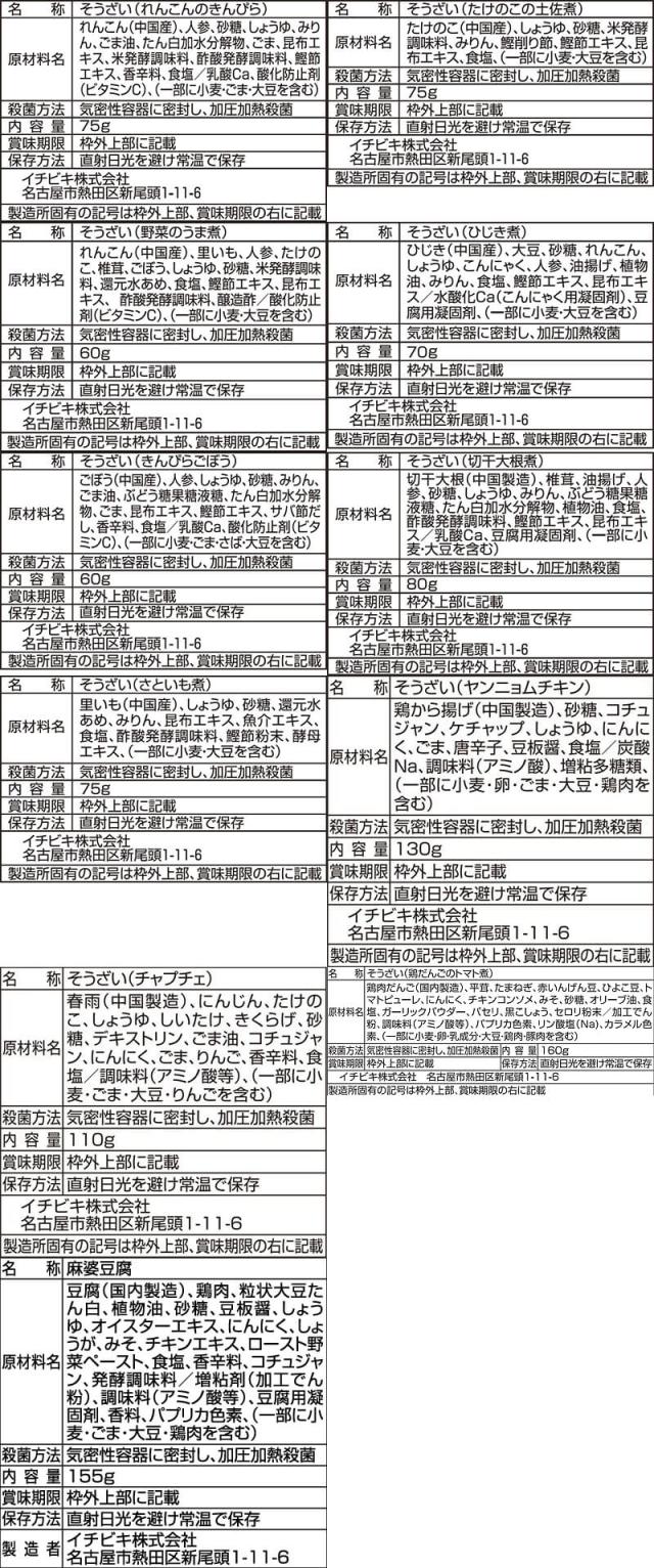 ■ おふくろの味 れんこんのきんぴら 75g たけのこの土佐煮 75g 野菜のうま煮 60g ひじき煮 70g きんぴらごぼう 60g 切干大根煮 80g 里いも煮 75g ■ おうち居酒屋 ヤンニョムチキン 130g チャプチェ 110g 鶏だんごのトマト煮 160g ■ 赤から 赤から麻婆豆腐 155g 11種 各2食 合計22食 |